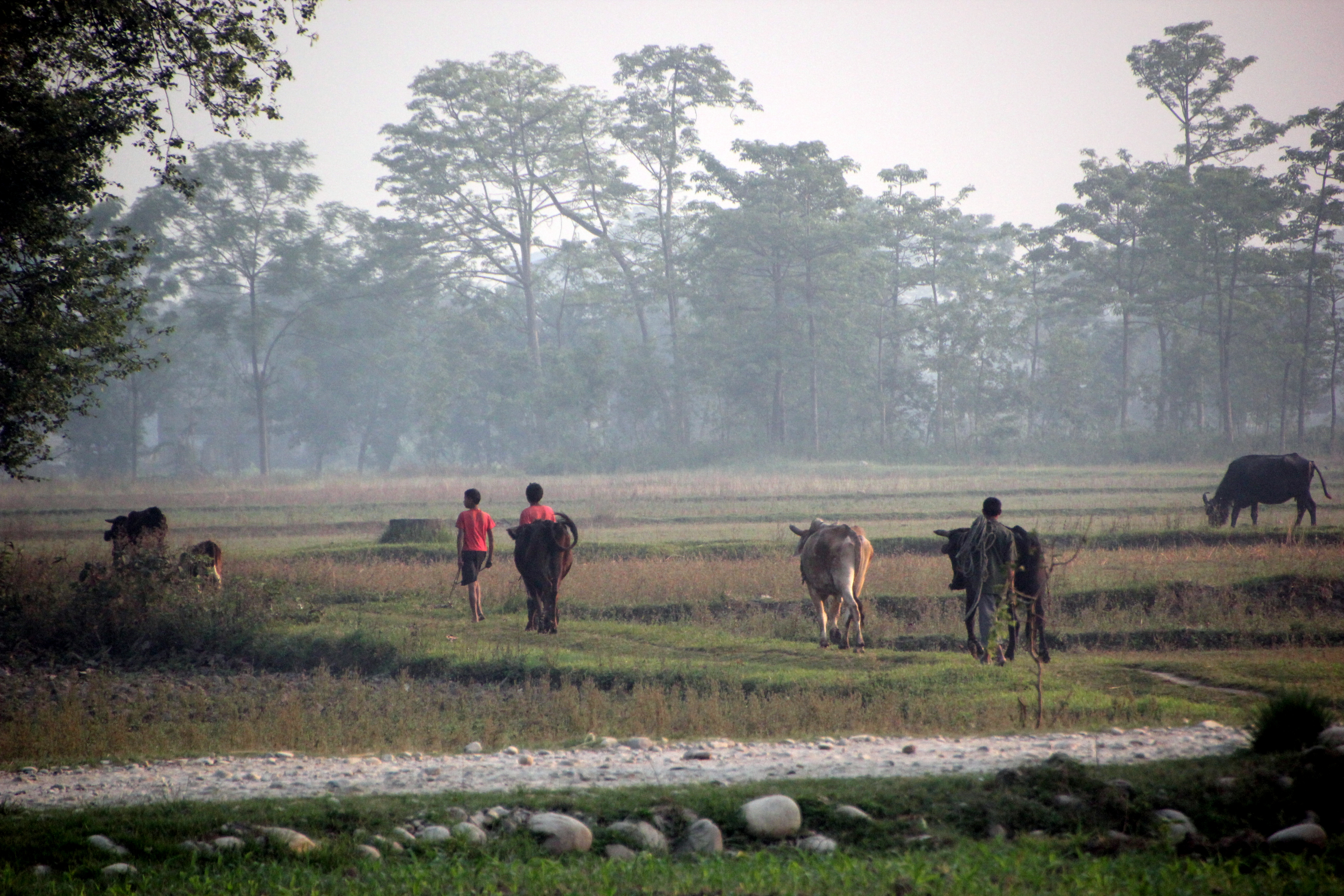 boys leading water buffalo